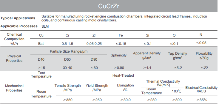 Also providing various powder products including GRCop-84, CuAlNiFe, CuNi2SiCr, etc. Customizable composition and particle size available.
